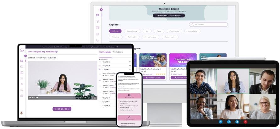 Healing From Narcissistic Relationships and Abuse is just the beginning. Stay supported with full access to everything inside the All-Access Pass: courses on attachment styles, boundaries, emotional mastery, and more, plus live webinars and a community of people who truly understand what you've been through.